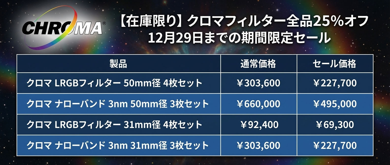 天体写真用途で高い評価を得ているクロマ社フィルターは、透過率の高さだけでなく、不要な光を通さないブロッキング性能に優れ、コントラストを確保しやすいことから、多くの撮影者に使用されています。現在、以下の在庫商品について25%引きのセール価格を適用しています。