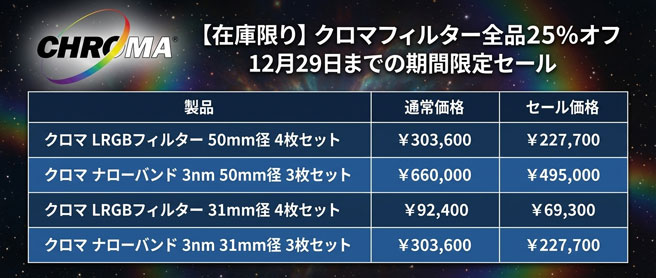クロマフィルター在庫品セール在庫品をすべて25%引にします。12月29日まで。